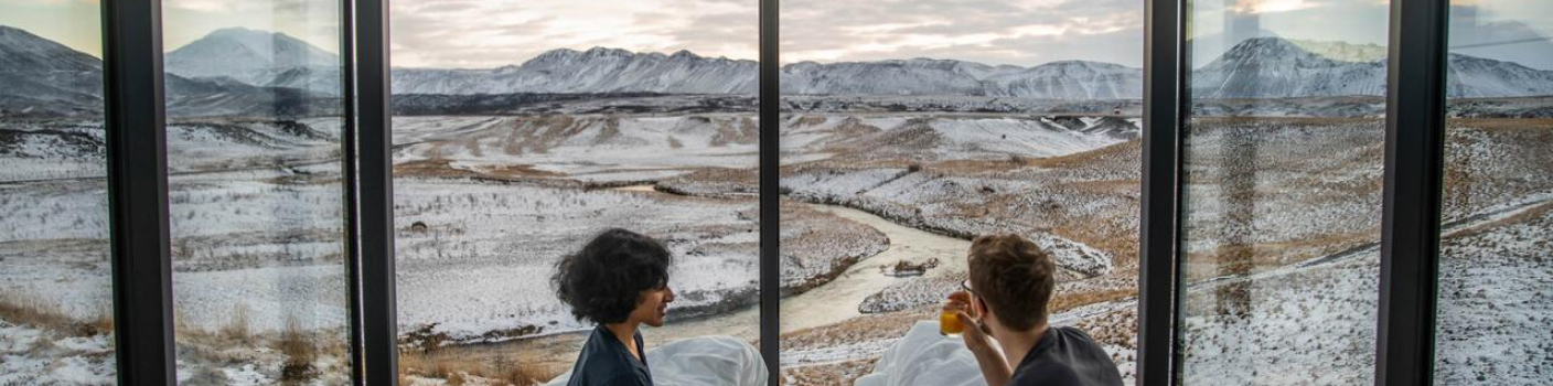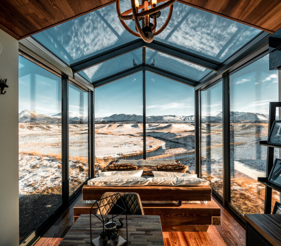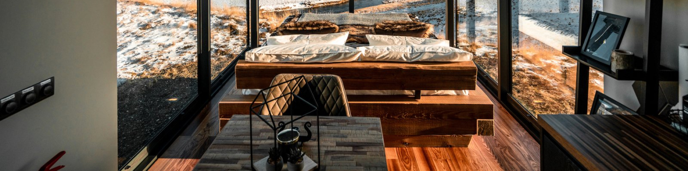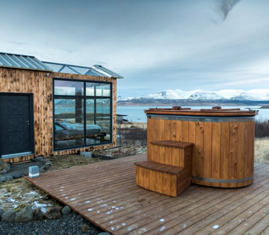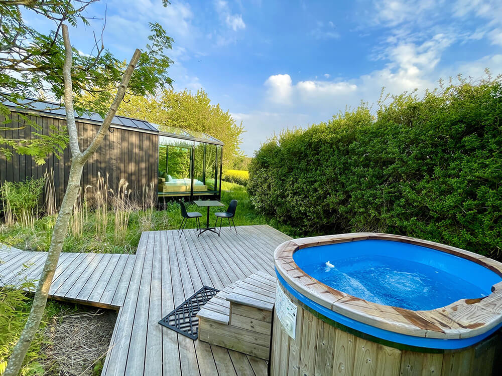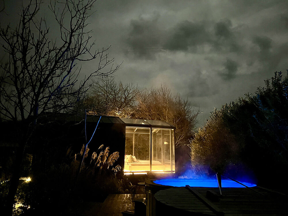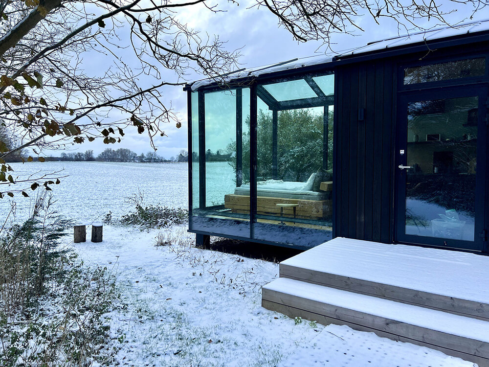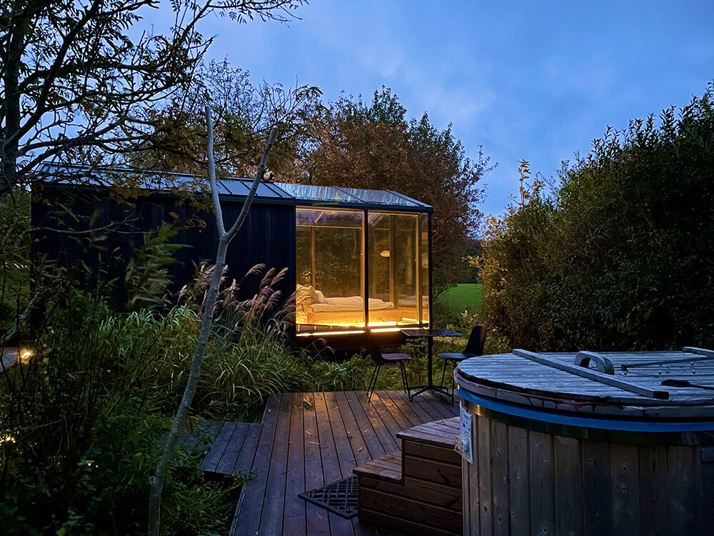 Løvtag’s three exclusive and comfortable cabins, Et, Ro and Ly, are designed by architect Sigurd Larsen. They all have an open space with a double bed, a double sofa bed, kitchen, separate toilet and an outdoor shower. On the roof, surrounded by treetops, there is a terrace, which is about nine meters above ground. The cottages are built around tall, old trees that go through the entire cottage from floor to ceiling.